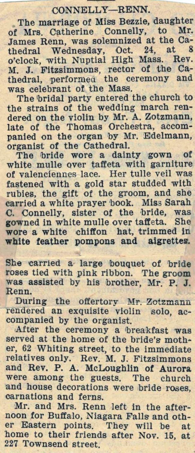 However it is that young Brigid and James met, the result was a wedding on Oct. 24th 1900. Details of the marriage were published, most likely in the official Catholic paper for the diocese, The New World. They were married at high mass in Holy Name Cathedral by the rector of the parish. The newspaper article describes the bridal party, the gowns of the bride and her sister, the violin solo, the flowers, and more. The bride’s tulle veil was fasted with a gold star studded with rubies, the gift of the groom. After a reception at the home of the mother of the bride at 62 Whiting St., Mr. and Mrs. Renn left in the afternoon for Buffalo, Niagara Falls and other Eastern points. They will be at home to their friends after Nov. 15, at 227 Townsend street.